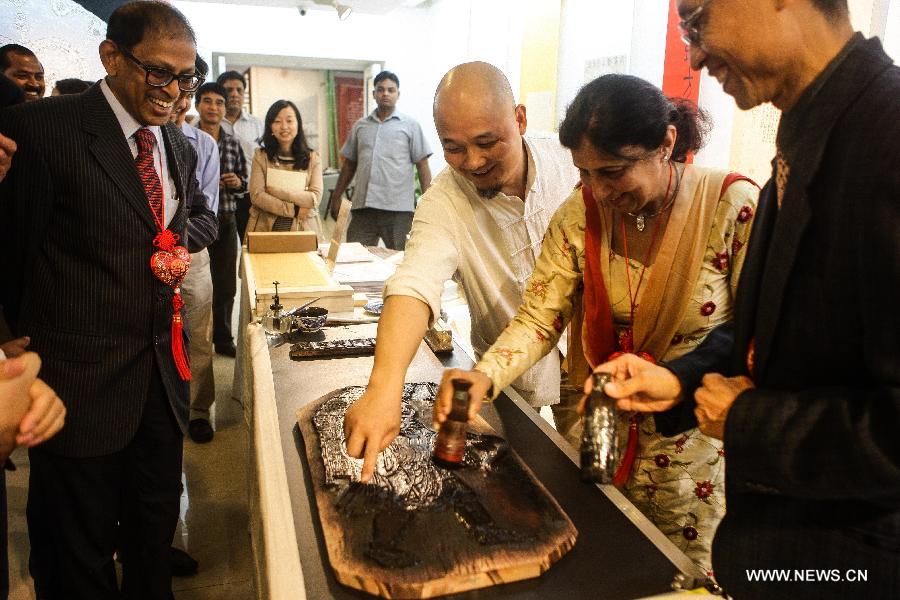 | Wei Lizhong (3rd R), a representative inheritor of intangible cultural heritage of Zhejiang and director of Hangzhou Shi Zhu Zhai Gallery, shows the woodblock printing to Ms. Jasminder Kasturia (2nd R) at the Heavenly Creations - Exhibition on Intangible Culture Heritage of China's Zhejiang Province, in the All India Fine Arts and Crafts Society in New Delhi, capital of India, Nov. 21, 2014. The five-day exhibition, which kicked off here on Friday with a selection of typical intangible culture heritages of Zhejiang, will show an integration of static artistic displays and dynamic performances. (Xinhua/Zheng Huansong) |