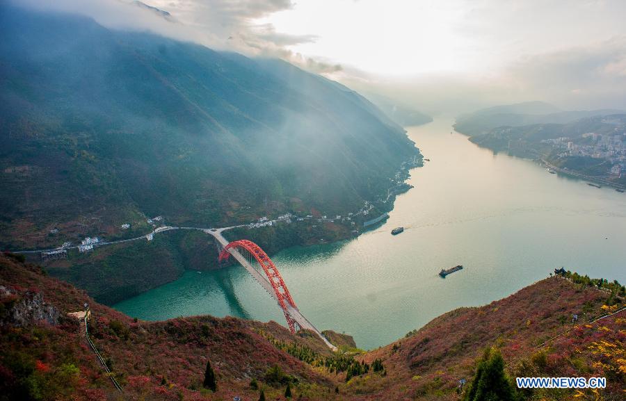 Photo taken on Nov. 25, 2014 shows a site of Wushan County, in southwest China's Chongqing Municipality. Covered by red leaves, Wushan County has developed the red leaves tourism for tourists. (Xinhua/Liu Chan)