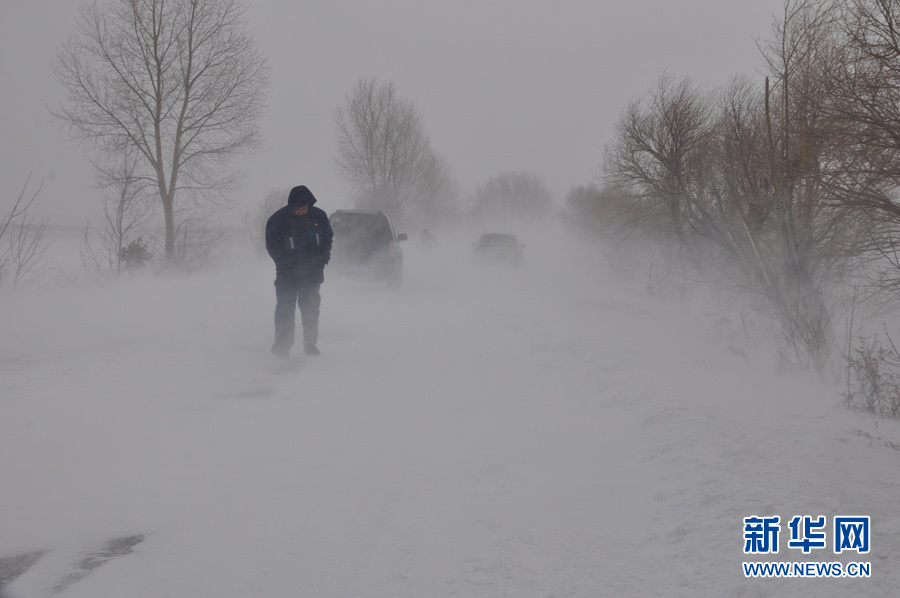 A man moves slowly on the snow-covered road in Heihe, northeast China's Heilongjiang province on Dec. 1, 2014. A strong cold front will sweep central and east China, bringing sharp temperature drops on Monday and Tuesday, the National Meteorological Center said on Monday. (Xinhua News Agency/Lu Wenxiang)