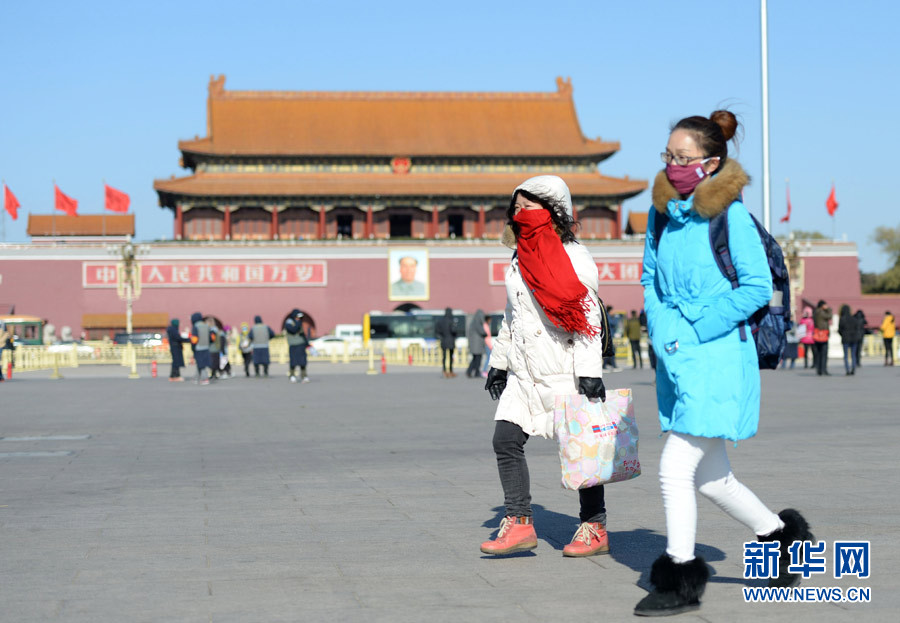Photo taken on Dec.1, 2014 shows two women with cotton-padded jackets walking on the Tiananmen Square in Beijing. A strong cold front will sweep central and east China, bringing sharp temperature drops on Monday and Tuesday, the National Meteorological Center said on Monday. (Xinhua News Agency/Chen Yehua)