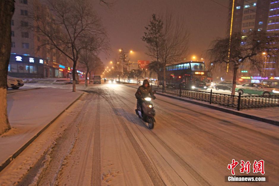People and vehicles move slowly on the snow-covered road in Jilin city, capital of northeast China's Jilin province on Nov. 30, 2014. A heavy snowfall hit most parts of Jilin province. Temperatures in some regions are expected to drop 20 degrees Celsius due to a coming cold front, according to local meteorological center. (Photo/China News service)