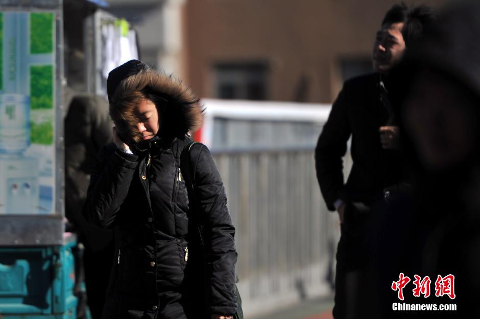 Photo taken on Dec.1, 2014 shows pedestrians with winter coats walking on the street to against the strong wind. A strong cold front will sweep central and east China, bringing sharp temperature drops on Monday and Tuesday, the Beijing Meteorological Station said on Monday. (China News Service/ Jin Shuo)