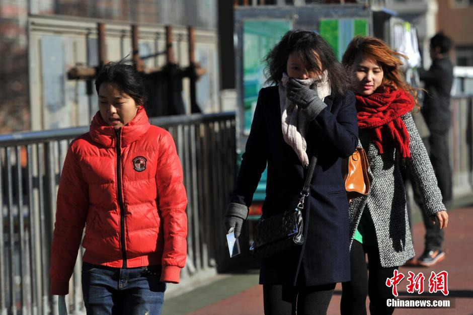 Photo taken on Dec.1, 2014 shows pedestrians with winter coats walking on the street to against the strong wind. A strong cold front will sweep central and east China, bringing sharp temperature drops on Monday and Tuesday, the Beijing Meteorological Station said on Monday. (China News Service/ Jin Shuo)