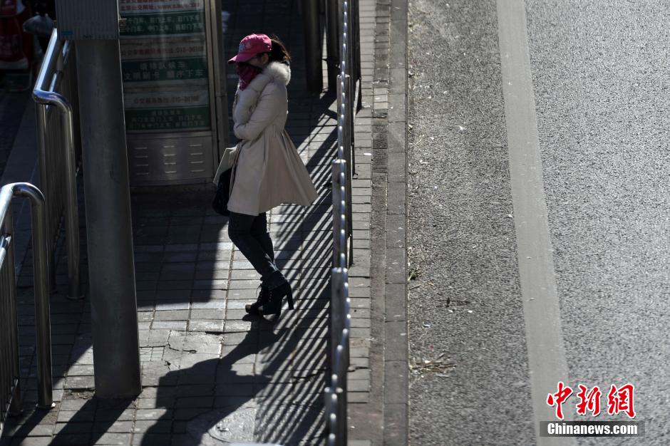 Photo taken on Dec.1, 2014 shows pedestrians with winter coats walking on the street to against the strong wind. A strong cold front will sweep central and east China, bringing sharp temperature drops on Monday and Tuesday, the Beijing Meteorological Station said on Monday. (China News Service/ Jin Shuo)
