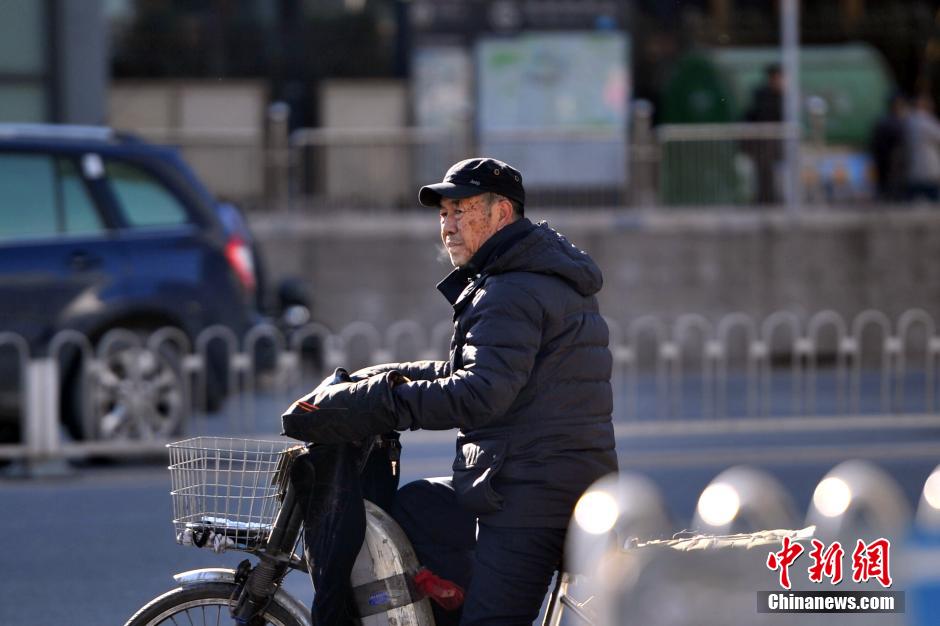 Photo taken on Dec.1, 2014 shows pedestrians with winter coats walking on the street to against the strong wind. A strong cold front will sweep central and east China, bringing sharp temperature drops on Monday and Tuesday, the Beijing Meteorological Station said on Monday. (China News Service/ Jin Shuo)