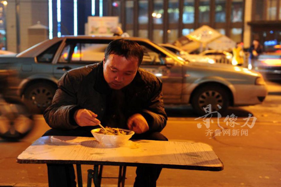 Xu Yang, a taxi driver in Jinan, eats a bowl of noodle by the roadside. (www.iqilu.com/Zhang Xiaobo)