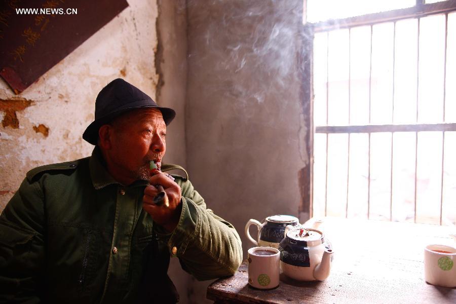 An elder smokes pipe in an old tea house in Linhuan Town, Suixi County of Huaibei City, east Chin's Anhui Province, Dec. 11, 2014. Linhuan Town, located in the southwest of Suixi County of Huaibei City in east China's Anhui Province, has a long history that can dates back to more than four thousand years ago. Local people of Linhuan has kept the tradition of drinking tea since Ming Dynasty, which leaves its print on people's life here through the old square table, the rough sand bowl and the rusty copper tea pot. Customers usually show up at the tea house at ten in the morning, where they can not only drink tea, but also smoke pipe, play cards, chat with each other and enjoy the leisure time. (Xinhua/Zhu Weixi)