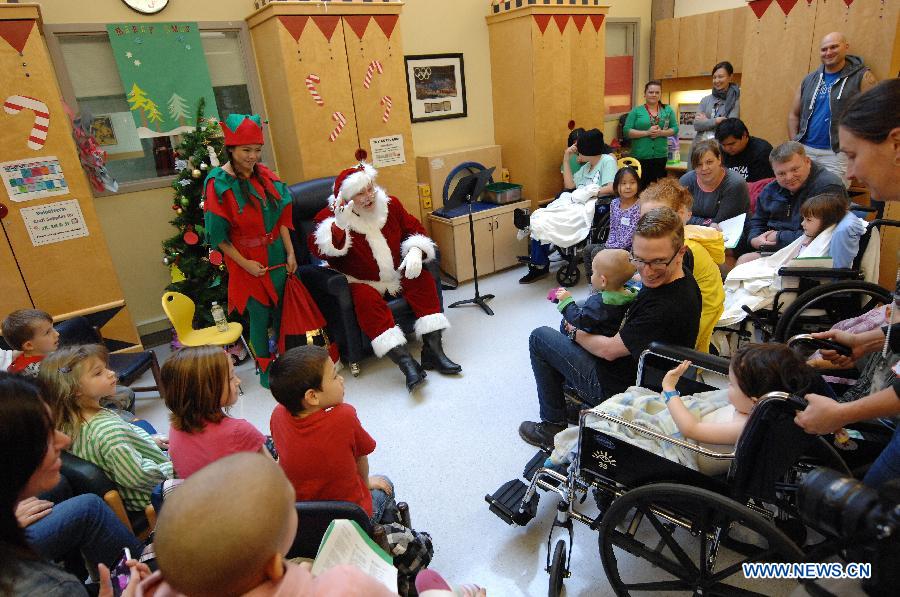 Santa Claus talks to ill children at BC Children's Hospital in Vancouver, Canada, Dec.16, 2013. BC Ambulance Service flew Santa Claus to the hospital to deliver presents and Christmas cheer to the kids on the hospitals' pediatric wards. (Xinhua/Sergei Bachlakov)