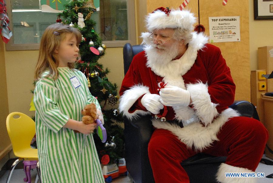 | Molly receives Christmas present from Santa Claus at BC Children's Hospital in Vancouver, Canada, Dec.16, 2014. BC Ambulance Service flew Santa Claus to the hospital to deliver presents and Christmas cheer to the kids on the hospitals' pediatric wards. (Xinhua/Sergei Bachlakov) |