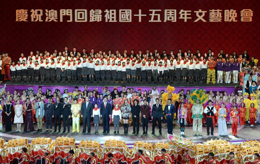 | Chinese President Xi Jinping sings "The Ode to the Motherland" along with performers after watching an evening gala marking the 15th anniversary of Macao's return to the motherland in south China's Macao, Dec. 19, 2014. (Xinhua/Qin Qing) |