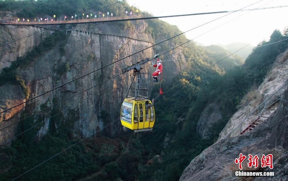 One staff member of the Shiniuzhai scenic spot, dressed like Santa Claus, climbs up a cable car to send gift to visitors for celebrating the up-coming Christmas in central China's Hunan Province. (CNS/ Yang Huafeng)
