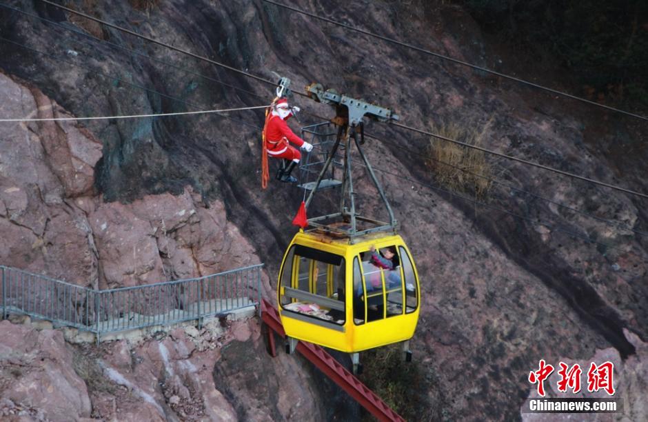 One staff member of the Shiniuzhai scenic spot, dressed like Santa Claus, climbs up a cable car to send gift to visitors for celebrating the up-coming Christmas in central China's Hunan Province. (CNS/ Yang Huafeng)