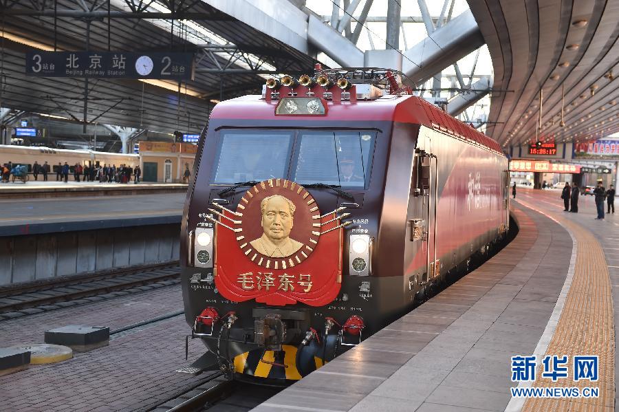Photo taken on Dec. 25, 2014 shows an upgraded locomotive named after the late Chinese leader Mao Zedong (1893-1976). The T1 train pulled by the locomotive bearing the portrait of Mao Zedong, left Beijing Railway Station on Thursday afternoon and is scheduled to arrive in Changsha, capital of Hunan on Friday morning. It is the fifth time the "Mao Zedong" has been upgraded. The new locomotive has a maximum speed of 160 km per hour. (Xinhua News Agency/Li Xin)