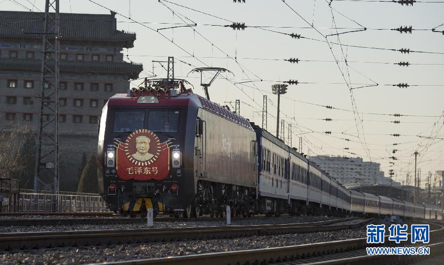 Photo taken on Dec. 25, 2014 shows an upgraded locomotive named after the late Chinese leader Mao Zedong (1893-1976). The T1 train pulled by the locomotive bearing the portrait of Mao Zedong, left Beijing Railway Station on Thursday afternoon and is scheduled to arrive in Changsha, capital of Hunan on Friday morning. It is the fifth time the "Mao Zedong" has been upgraded. The new locomotive has a maximum speed of 160 km per hour. (Xinhua News Agency/Li Xin)