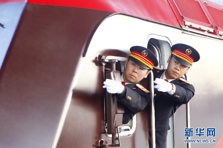 Train conductor Liu Yufeng(L) and his associate make a gesture before departure. (Xinhua News Agency/Li Xin)