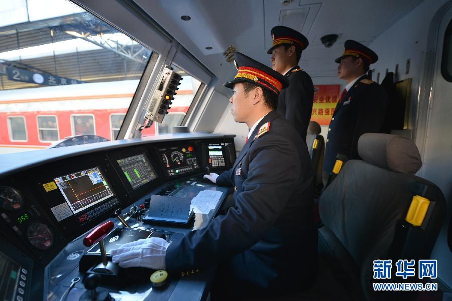 Train conductor Liu Yufeng(L) and his associate make a gesture before departure. (Xinhua News Agency/Li Xin)