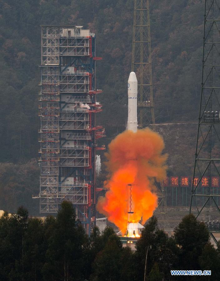 A Long March 3A rocket carrying meteorological satellite Fengyun-II 08 blasts off from the launching pad at Xichang Satellite Launch Center, southwest China's Sichuan Province, Dec. 31, 2014. China successfully launched Fengyun-II 08, its meteorological satellite, at 9:02 a.m. on Wednesday. The satellite will collect meteorological, maritime and hydrological data; and transmit information that will be used for weather forecasting and environment monitoring. (Xinhua/Liu Chan)