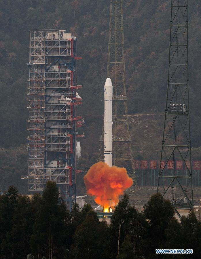 | A Long March 3A rocket carrying meteorological satellite Fengyun-II 08 blasts off from the launching pad at Xichang Satellite Launch Center, southwest China's Sichuan Province, Dec. 31, 2014. China successfully launched Fengyun-II 08, its meteorological satellite, at 9:02 a.m. on Wednesday. The satellite will collect meteorological, maritime and hydrological data; and transmit information that will be used for weather forecasting and environment monitoring. (Xinhua/Liu Chan) |