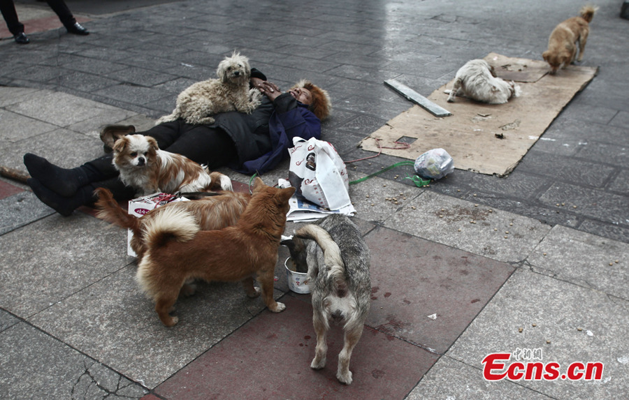 A 76-year-old man with stray dogs begs on a street in Guiyang, Southwest China's Guizhou province, Jan 20, 2015. The beggar, carrying a poster saying "Stray Dogs Begging Team," said the money he got was to feed himself and the stray dogs. [Photo: China News Service/Peng Nian]