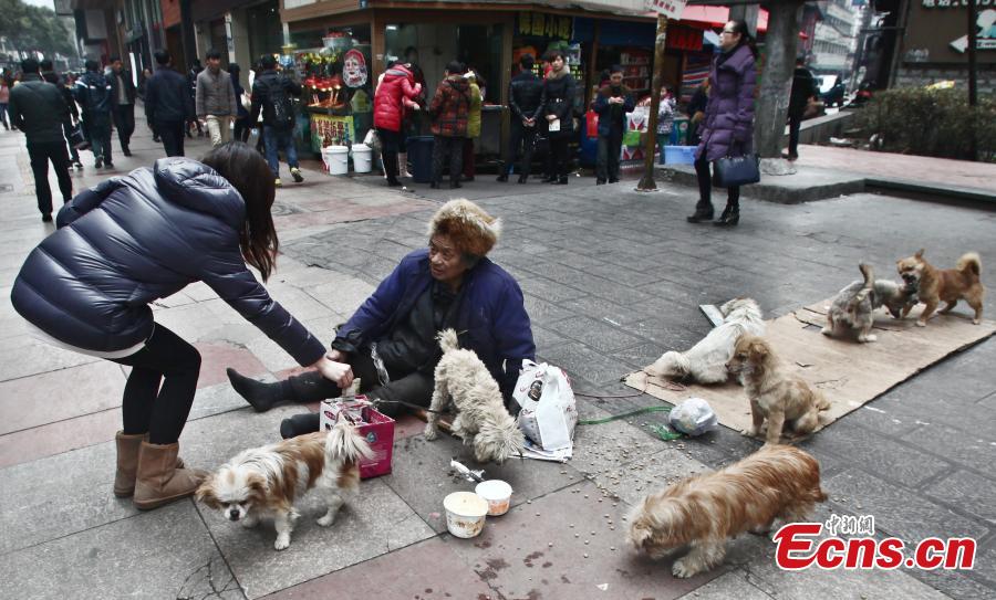 A 76-year-old man with stray dogs begs on a street in Guiyang, Southwest China's Guizhou province, Jan 20, 2015. The beggar, carrying a poster saying "Stray Dogs Begging Team," said the money he got was to feed himself and the stray dogs. [Photo: China News Service/Peng Nian]