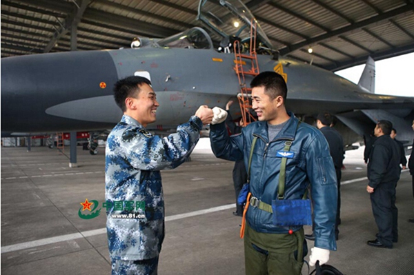| Jiang Jiaji, 34, (R)a squadron commander with the Chengdu Military Command conducts combat training with elite aviators together. (Photo/ Liu Yinhua) |