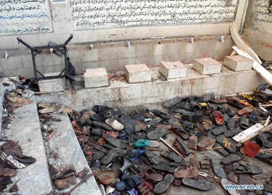 Shoes of victims are seen at the blast site in southern Pakistan's Shikarpur on Jan. 30, 2015. At least 35 people were killed and over 50 others injured as a blast hit a Shia Mosque in Pakistan's southern district of Shikarpur on Jan. 30 afternoon, officials said. (Xinhua/Stringer)