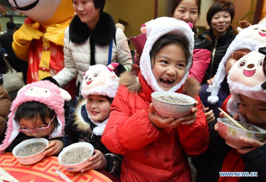 Children eat Laba congee at a buddhist temple in Nanjing, capital of east China's Jiangsu Province, Jan. 27, 2015. Laba, a traditional Chinese festival celebrated on the 8th day of the 12th lunar month, fell on Jan. 27 this year. It is a tradtion to eat Laba congee to mark the festival, and it is also a tradition of some temples and non-profit organizations to distribute the congee for free on this day. (Xinhua/Sun Can)