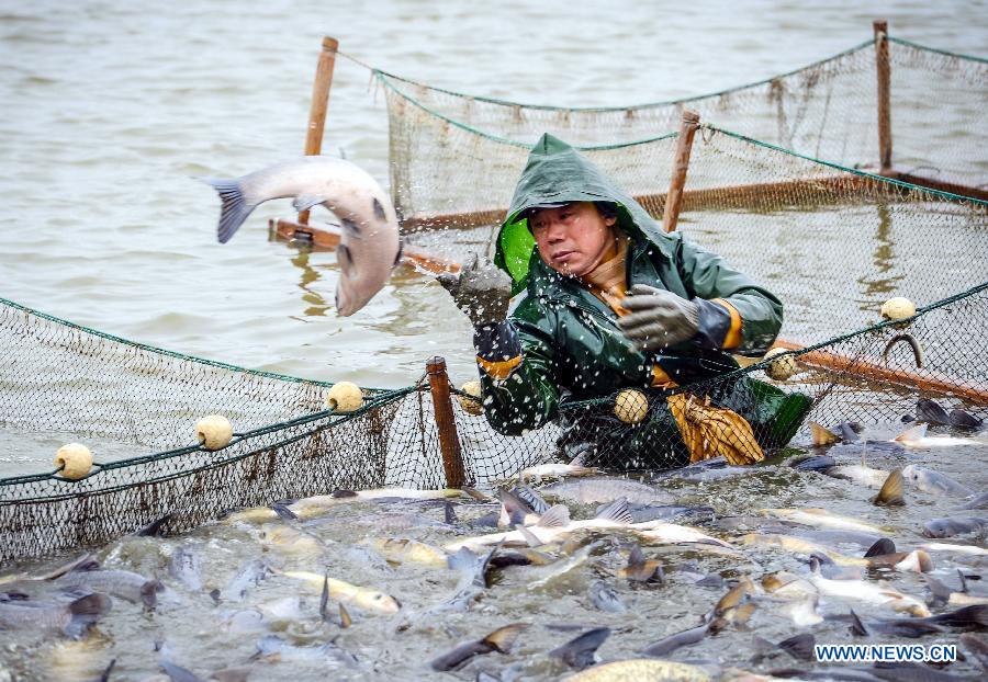 A fisherman sorts fish into different net pens at a pond in Deqing County, Huzhou City, east China's Zhejiang Province, Jan. 30, 2015. Local fishermen started the last catching from their fish farms before the upcoming Spring Festival, which falls on Feb. 19 this year. (Xinhua/Xu Yu)