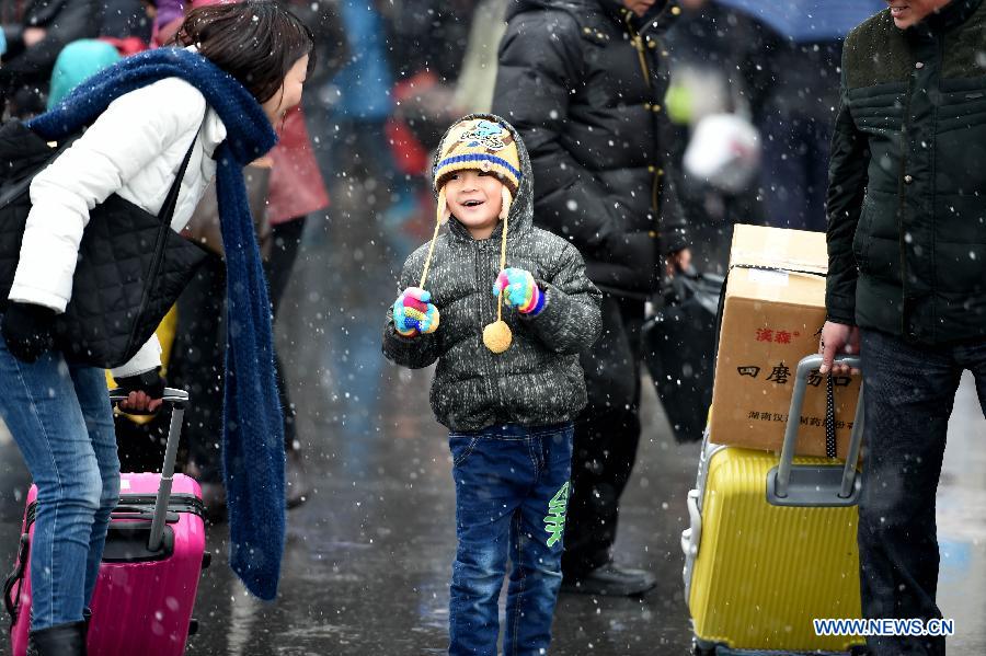 A boy walks in the snow at the square of the Hefei Railway Station in Hefei, capital of east China's Anhui Province, Jan. 29, 2015. Anhui greeted a heavy snow recently, when students started their journey home for winter vacation. (Xinhua/Liu Junxi)