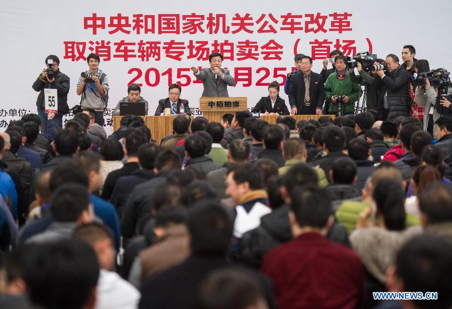 Photo taken on Jan. 25, 2015 shows an auction for the official vehicles in Beijing, capital of China. The central government has impounded 3,184 official vehicles and plans to auction the first 300 before the Spring Festival. (Xinhua/Luo Xiaoguang)