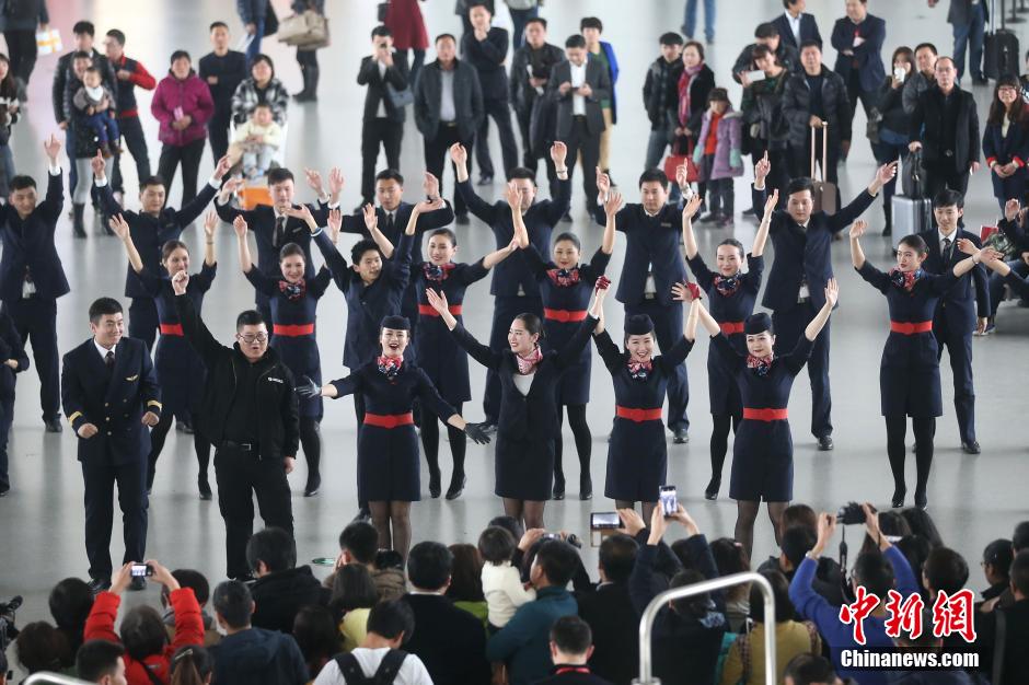 | On Feb. 2, 2015, flight attendants perform flash mob dance to melodies at Nanjing Airport. (CNS/Yang Bo) |