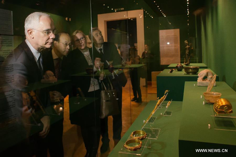 Hungarian Human Resources Minister Zoltan Balog (1st L) and China's Ambassador to Hungary Xiao Qian (2nd L) visit an exhibition called Treasures of Ancient China at the Museum of Applied Arts in Budapest, Hungary, on Feb. 6, 2015. (Xinhua/Attila Volgyi)