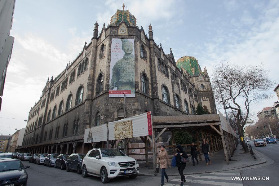 A poster of a terracotta soldier is seen outside the Museum of Applied Arts where an exhibition called Treasures of Ancient China opened in Budapest, Hungary, on Feb. 6, 2015. (Xinhua/Attila Volgyi)