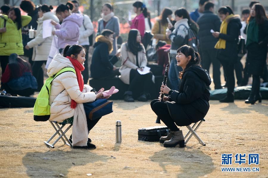 Candidates for music majors make preparation before taking an exam at Artistic Vocational College of Anhui, Jan. 22, 2015. The exam will last until Feb. 8. (Xinhua Photo)
