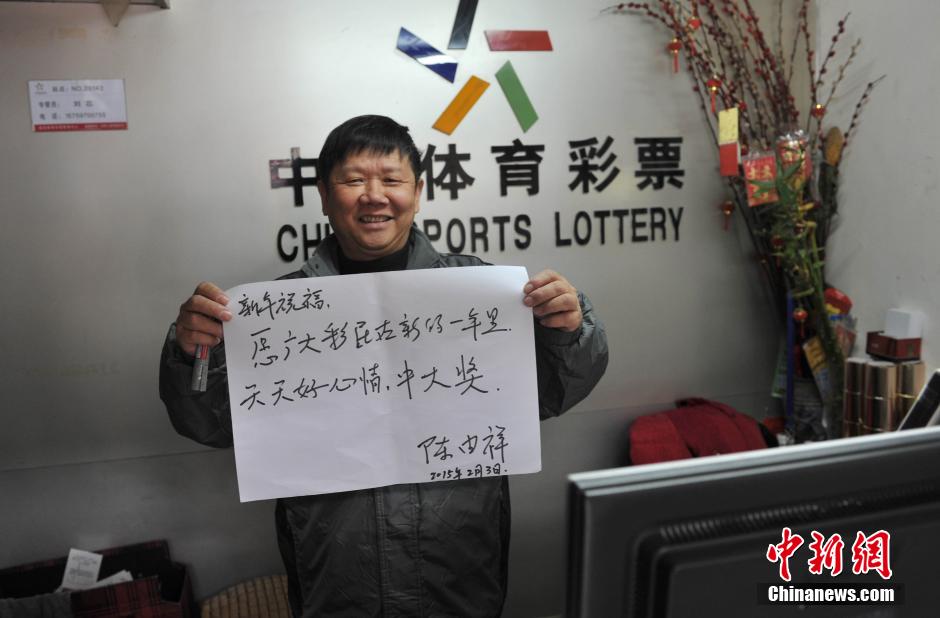 Chen Youxiang, a person in charge of a sports lottery station, wishes the lottery buyers good luck in the new year. (CNS/Lu Ming)