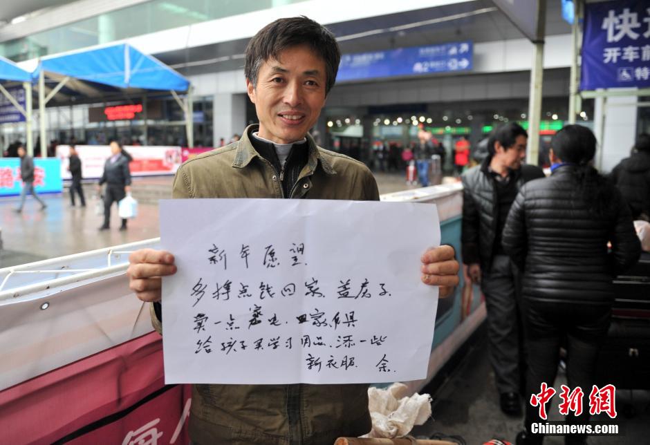 Xu, a migrant worker, has been in Fuzhou for three years. He goes back home every Spring Festival. He hopes to get more money, repair the house, and buy some school supplies and new clothes for his son. (CNS/Lu Ming)