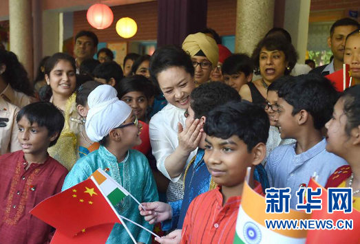 | Peng Liyuan is with school students of India. (Photo/Xinhua) |