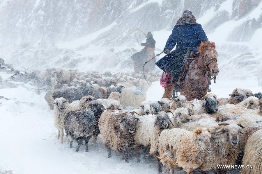 | A herdsman drives sheep on a snow-covered path in Ili Kazak Autonomous Prefecture, northwest China's Xinjiang Uygur Autonomous Region, March 12, 2015. Herdsmen in Ili started a transfer of their sheep, a 300-kilometer journey to the spring/autumn pasture. (Xinhua/Lai Yuning) |