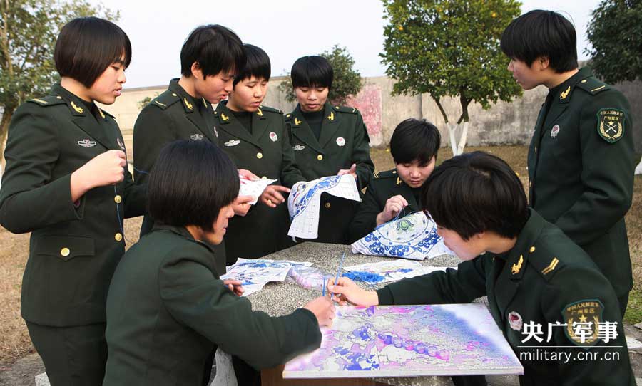 Female soldiers make craftworks with embroidery needles. (www.cnr.cn/Wu Zhongyong)