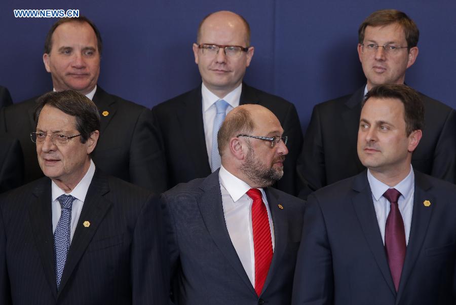President of European Parliament Martin Schulz (C, front) attends the family photo session of European Union (EU) summit with EU heads of state in Brussels, Belgium, on March 19, 2015. European heads of state gathered here to hold the regular spring summit debate Thursday, with development of the Energy Union, situation in Ukraine, relations with Russia, and the EU's economic situation top on the agenda.(Xinhua/Zhou Lei)