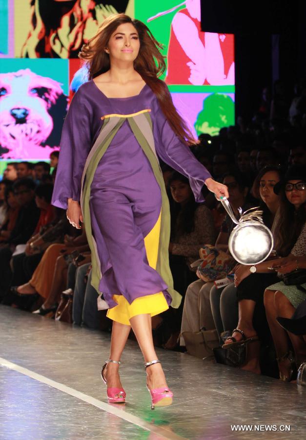 | An Indian model presents a creation by designer Wendell Rodricks during the Lakme Fashion Week Summer Resort 2015 in Mumbai, India, March 22, 2015. (Xinhua/Stringer) |