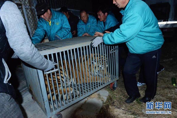 A female tiger, which was illegally kept in an apartment building in Pingdu, is transferred to a wildlife center in Qingdao, Shandong Province on February 26. (Photo/Xinhua)