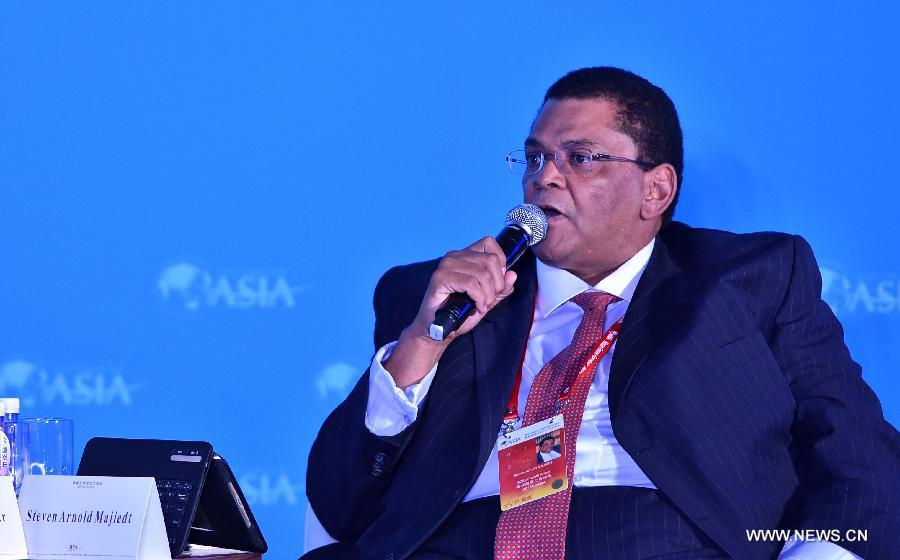 Steven Arnold Majiedt, Justice of the Supreme Court Appeal of South Africa, speaks at a sub-forum with the theme of "BRICS Chief Justices' Dialogue: Pollution Control: the Power of Judiciary" during the 2015 Boao Forum for Asia (BFA) in Boao, south China's Hainan Province, March 29, 2015. (Xinhua/Zhao Yingquan)