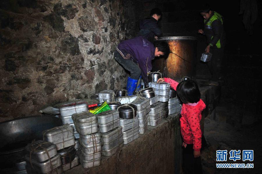 Students put their lunch box into the pot on Dec. 27, 2012. With the new canteen, the children need not to prepare for the lunch anymore. (Xinhua/Huang Xiaobang)