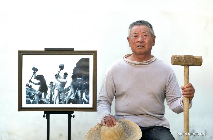 Xue Weiyuan, 75, poses for a picture with an old photo showing the construction site of Longhekou Reservoir in Shucheng County, east China's Anhui Province, March 31, 2015. Xue Weiyuan was a monitor of a construction team in building Longhekou Reservior. He was the second person in the left in the old photo. Longhekou Reservoir, which has a storage capactiy of 903 million cubic meters, was built on the Hangbu River in 1958 under the joint efforts of tens of thousands residents of Shucheng County. The reservoir, as a headwork of the Pishihang irrigation area, still plays a vital role in preventing flood, irrigation and urban water supply. (Xinhua/Lyu Wunong)
