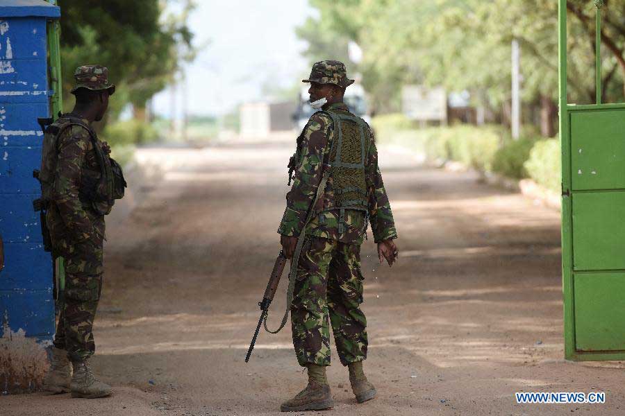 Two Kenyan soldiers stand guard at the entrance of Moi University campus in Garissa, northeastern Kenya, April 3, 2015. Ambulances were seen going in and out of the university campus on Friday morning, as police cordoned off the campus and deployed security forces patrolling around major roads in Garissa. (Xinhua/Sun Ruibo)