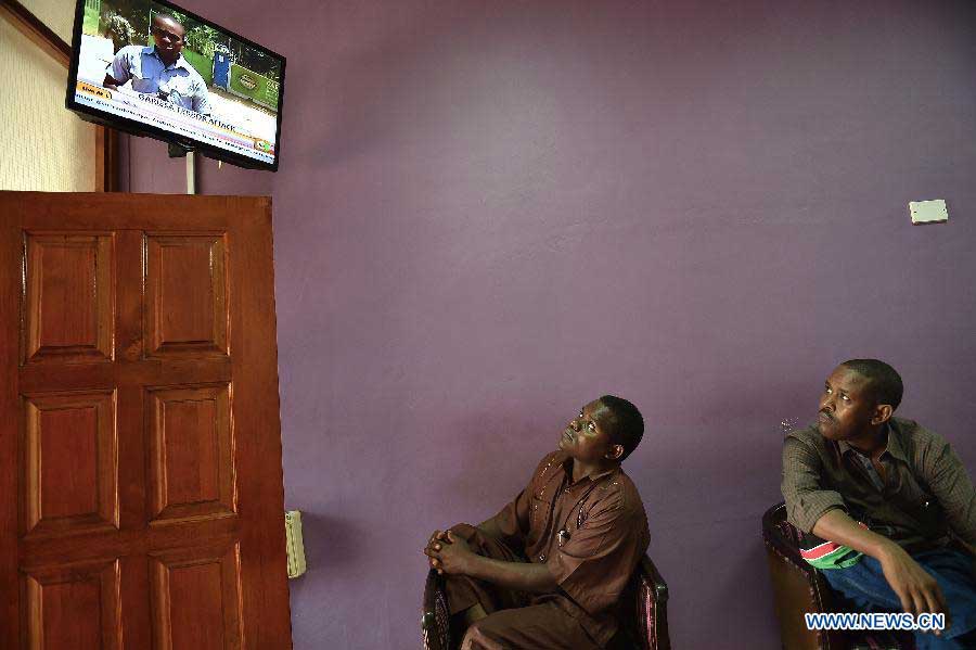 Local citizens watch the news about the campus attack on TV in Garissa, northeastern Kenya, April 3, 2015. Ambulances were seen going in and out of the university campus on Friday morning, as police cordoned off the campus and deployed security forces patrolling around major roads in Garissa. (Xinhua/Sun Ruibo)