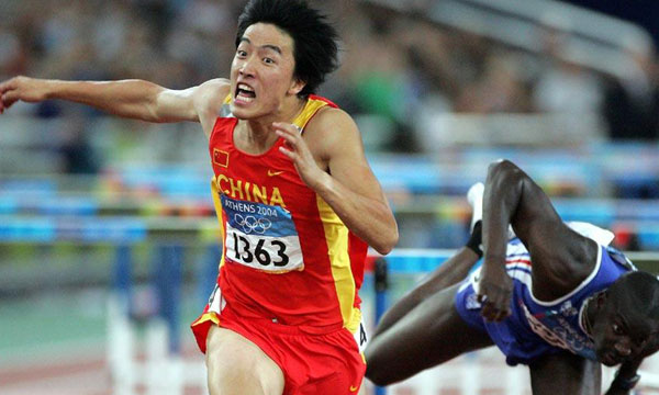 Liu clears the final hurdle on his way to gold in the 110m hurdles as France's Ladji Doucoure hits the last obstacle in the 2004 Olympic Games in Athens, Greece, Aug 27, 2004. Liu won in a world record-equaling time of 12.91 sec, matching the feat of Colin Jackson, who ran 12.91 sec in Stuttgart, Germany, in August 1993. He was China's first men's Olympic gold medal winner in track and field. (Photo by Xu Jingxing/China Daily)