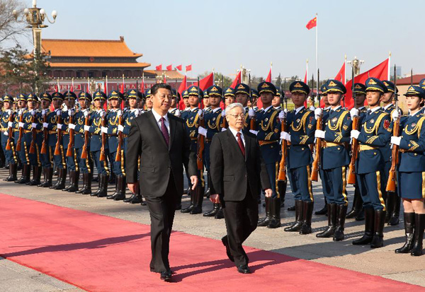 | Chinese President Xi Jinping (L), who is also general secretary of the Central Committee of the Communist Party of China, holds a welcoming ceremony for Nguyen Phu Trong, general secretary of the Central Committee of the Communist Party of Vietnam, before their talks in Beijing, China, April 7, 2015. (Xinhua/Pang Xinglei) |