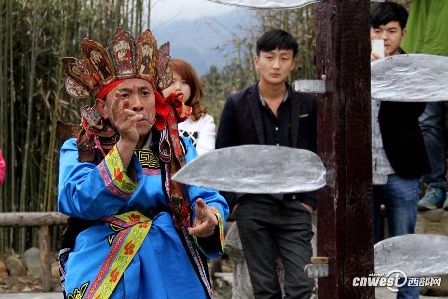 | Folk artists perform climbing knife mountain and going over knife-edge bridge at the Qiang Ethnic Minority Group Museum, Ningqiang county of northwestern China's Shaanxi province on April 6, 2015. Covering an area of about 5,033 square meters, the museum is the only one dedicated to the Qiang ethnic group in Shaanxi. (Cnwest/Photo) |